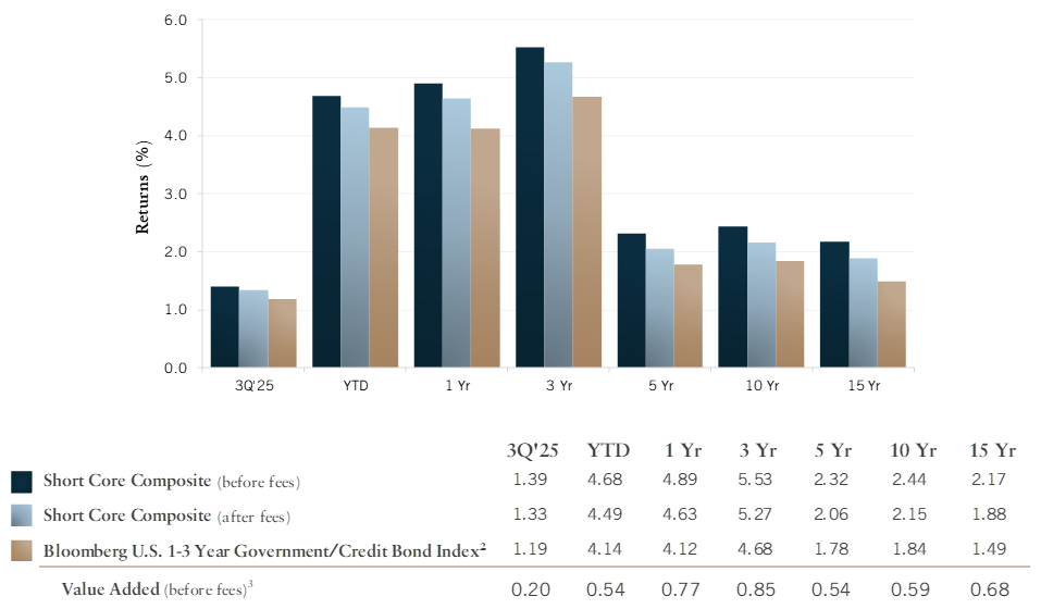1: Returns for periods less than one year are not annualized. Returns designated as being “before fees” include all income, realized and unrealized gains and losses, and all transactional costs. Returns designated as “after fees” are the “before fees” returns less the maximum investment management fee of 0.25% which may be charged by Galliard for management of each client’s account. For more information, please refer to to the GIPS composite report found under Disclosure in the Reporting Resources tab. 2: Linked Benchmark: Prior to July 1, 2018, was the Bloomberg U.S. 1-3 Year Government Bond Index. Benchmark returns do not include potential transaction costs or management fees. For comparison purposes the benchmark is fully invested and includes the reinvestment of income. While it is believed that the benchmark used here represents an appropriate point of comparison for the composite referenced above, prospective investors should be aware that the volatility of the above referenced benchmark or index may be substantially different from that of the composite; and holdings in the composite may differ significantly from the benchmark or index if the investment guidelines and criteria are different than the composite. 3: May not add due to rounding. Past performance is not an indication of how the investment will perform in the future.