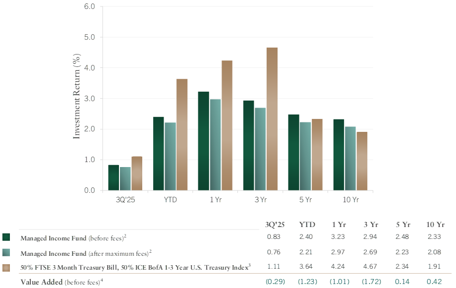 1: Returns for periods less than one year are not annualized. 2: Returns designated as “before fees” include all income, realized and unrealized capital gains and losses and all annual fund operating expenses. These returns also include all non-affiliated subadvisor fees, audit and valuation fees. Returns designated as “after maximum fees” are the “before fees” amounts less the maximum 0.25% fee which may be charged by Galliard for management of each client’s account. Returns may have been impacted by the effect of compounding and have been rounded to the nearest basis point. Fees which may be charged to each client for investment management are described in Galliard Capital Management’s Form ADV Part 2 which is available upon request. 3: Benchmark returns do not include potential transaction costs or management fees. © 2025 Ice Data Indices, LLC. All rights reserved.While it is believed that the benchmark used here represents an appropriate point of comparison for the Fund referenced above, prospective investors should be aware that the volatility of the above referenced benchmark or index may be substantially different from that of the Fund; and holdings in the Fund may differ significantly from the benchmark or index if the investment guidelines and criteria are different than the Fund. 4: May not add due to rounding.